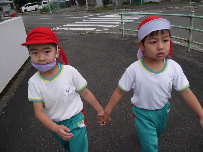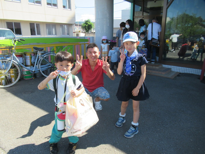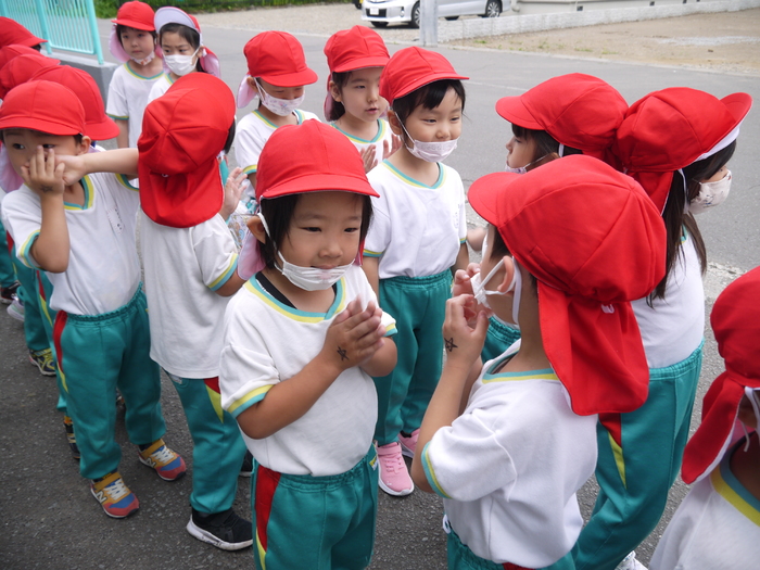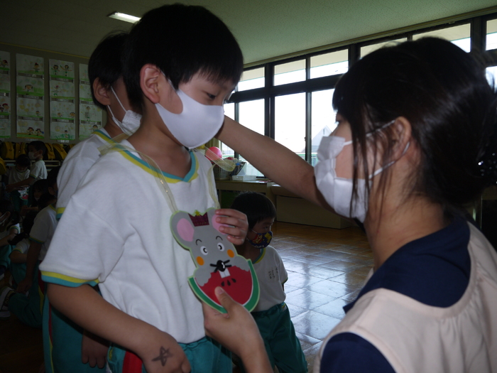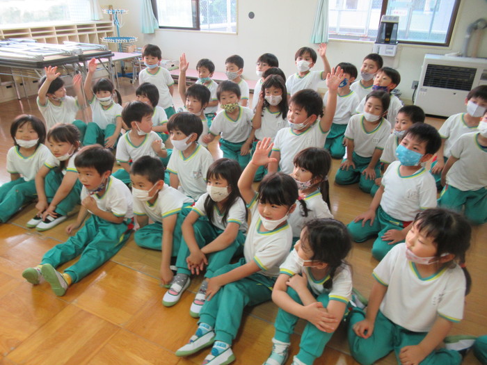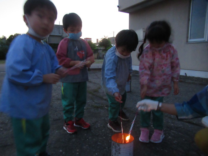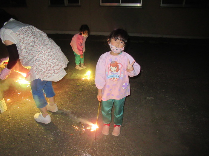 1学期の終業式を終えた7月18日(土)/19日(日)の2日間、お泊り会で年長組のお友達が幼稚園にお泊りしました。残念ながら発熱で1名欠席となりましたが34名のお友達が楽しく2日間過ごしました。1日目は、幼稚園に登園後 園バスに乗って旭ヶ丘公園に行きました。公園内の動物や名所が隠されたクロスワードを解きながら、公園探索!〝お・い・し・い・か・れ・-〟の回答を解いて幼稚園に帰園。その後は、自分たちの寝る布団を運び 次は、待ちに待った〝おいしいカレー〟の夕食。ゼリーのデザートも含め全員完食しました。例年は、園庭で盆踊りや千人踊りを楽しんでいましたが今年度は、新型コロナウイルス感染症拡大予防のため全国的にお祭りや花火大会が中止になっているという現状から子ども達に盛大な日本の有名な花火大会を見せてあげたいとの思いもあり、スクリーンに花火大会の様子を映し、観賞。映像であってもすごい迫力の花火に子ども達も大興奮でした。その後、外に移動し 手持ち花火を楽しんでいた子ども達です。 自分たちの寝る場所の準備を整え、この日のために…と用意していただいたパジャマに着替た姿をとっても嬉しそうに見せてくれました。1日目のラストは〝肝試し…😨〟みんなで勇気の印をもらえるよう、頑張りました。スヤスヤ就寝し、1日目無事に終了。 2日目は、起床し 朝の身支度を各自で行いその後、朝のお散歩・アンパンマン体操をしました。爽やかに体を動かした後は、朝食です。クロワッサンにナポリタン、ミートボール、ウインナー、玉子焼き、ミニトマトとなかなかのボリュームでしたがみんな昨日の肝試しの話で盛り上がりながら、モリモリ食べていました。楽しい時間は、あっという間に過ぎ 降園の時間となり、肝試しで頑張ってゲットした〝勇気の印〟先生に見せ、ごほうびペンダントとごほうびシール、おやつをもらった子ども達の顔は、1日前よりも逞しくキラキラと輝いていました。お帰りのご挨拶をして、自分の大きな荷物を持っておうちの人が待つ、玄関に降りてきた子ども達。2日間のお泊り会での経験がこれからの大きな成長に繋がっていくことでしょう。子ども達のニッコニコの楽しそうな様子をご紹介します!! | ||