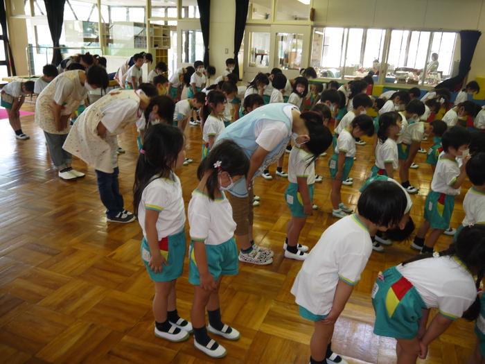 2学期始業式・クラス内での夏休みの思い出発表の様子です。久しぶりの幼稚園に不安そうにする子、緊張している子もいましたが、お友達と遊んでだり、先生と触れ合ったりするにつれ園生活を思い出して笑顔で過ごす様子が見られました。思い出発表では、プールやキャンプ焼肉、花火など夏ならではの思い出を色々教えてくれました。また、絵や作品を見せながら何を描いたのか作ったのか嬉しそうに話してくれます。これからまだまだ暑い日は続きますが、しっかり暑さ対策をしながら有意義な2学期にしていきたいと思います。 | ||