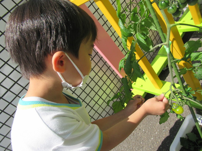 年長児がトマト・ジャガイモを収穫しました☆彡 枝豆は残念ながら収穫することは出来ませんでしたが、トマトとジャガイモは大喜びで収穫することが出来ました。 〝自分たちで育てた野菜〟ということもあり、喜びや楽しさが倍以上あった子ども達。この経験を通して今後も様々な事にチャレンジしていって欲しいと思います。 では、そんな子ども達の様子を是非ご覧下さい。 | ||