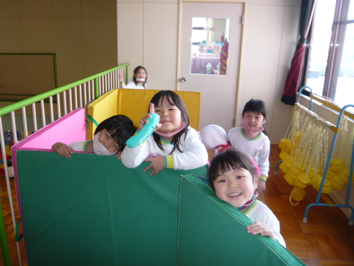 ホールでは、鬼ごっこ、積み木、すべり台などなど…お部屋では、パズル、粘土、お絵描き等毎日それぞれ好きなことをして遊んでいます☆彡 | ||