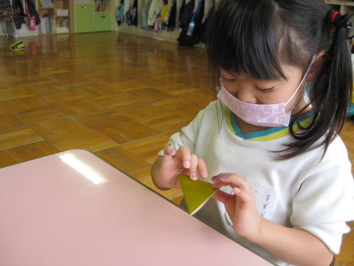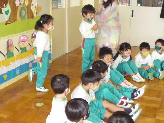 11月9日(月) この日は、クラスで〝ハンカチ落としゲーム〟〝折り紙製作(折る)〟をしました。 | ||