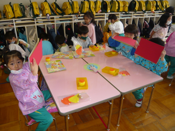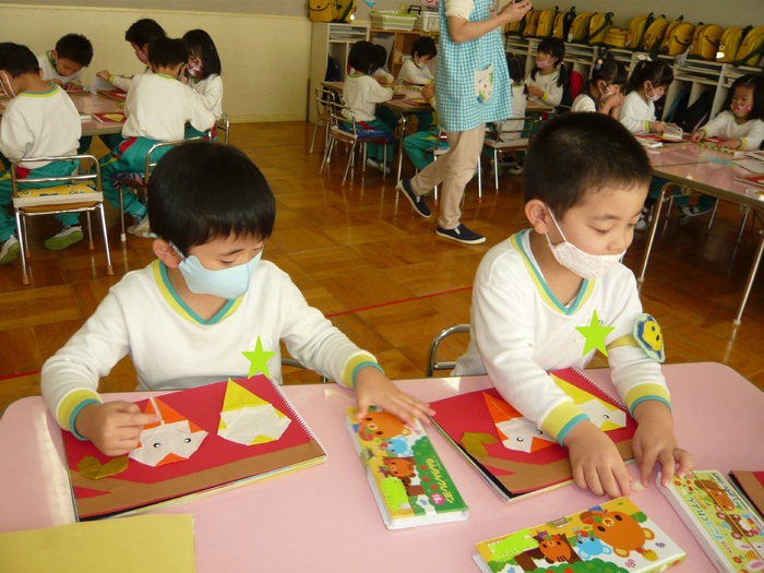 11月10日(火)は、集会のためクラス活動はお休み◇ 11月11日(水)は、折り紙製作(のり付け)をしました! | ||