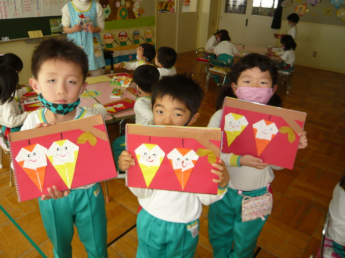 今回は、すずらん組(1週間分)の普段の様子を紹介していきます☆彡 すずらん組の第2週目は、3日間に分けて折り紙製作やクラスでゲーム、集会など゙…毎日楽しく過ごすことが出来ました。折り紙製作では、角と角をしっかり合わせて折ったり、最後まで丁寧に折ろうとする姿が見られました。また、完成した折り紙を見て満足気な様子の子ども達でした(^▽^)/ 自由遊びの時間では、お友達と一つの物を作り上げる楽しさを味わいながら遊んでいました。遊びの展開も様々で時には、小さいクラスのお友達におもちゃを貸してあげたり、少しお兄さん、お姉さんになった所も見られ成長も感じられまた。 たくさん遊んだ後は、大好きな給食・お弁当の時間です☆お箸で食べるのも上手になりましたよ~!お弁当の日には、お友達同士で何のお弁当か見せ合いっこしています( *´艸`)モリモリ食べた後は、帰りの時間までパワフルに遊びます! それでは、元気百倍なすずらん組の子ども達をご覧下さい♪ | ||