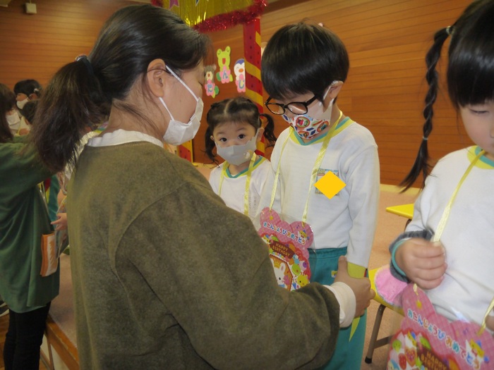 11月の誕生会では、13名の可愛らしいお友達が誕生日を迎えました☆ ちょっぴり恥ずかしそうにしている子もいれば、元気いっぱい大きな声で自分のクラスと何歳になったかを発表してくれる子もいました。先生達からのメッセージカードを胸にお友達から沢山の『おめでとう』の言葉のプレゼントも貰い、とっても嬉しそうな13名の誕生者さん達でした♪ 今月のお楽しみは、パネルシアター〝おふろだいすき〟みんなで盛り上がりながら楽しそうに踊る姿も見られましたよ~♡ | ||