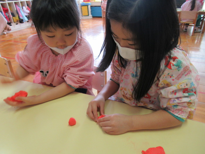 今週も、お店屋さんごっこの品物作りを行いました。自分のクラスで朝の会が終わると、チームごとに必要な道具を持って集合しました。「今日は何を作るのかなぁ?」と、ウキウキさせながら説明を聞いている子ども達。自然と他学年とのペアが出来上がっていたり、製作後には一緒におままごとやブロックで遊ぶ姿も見られ、仲が深まっている様子が感じられました。また、出来上がった品物を見て「食べたーい♪」「絶対買おう☆」などと言う可愛らしい姿も見られました。今回は、『いちごグループ』と『ハリネズミグループ』の様子をご紹介します。 | ||
