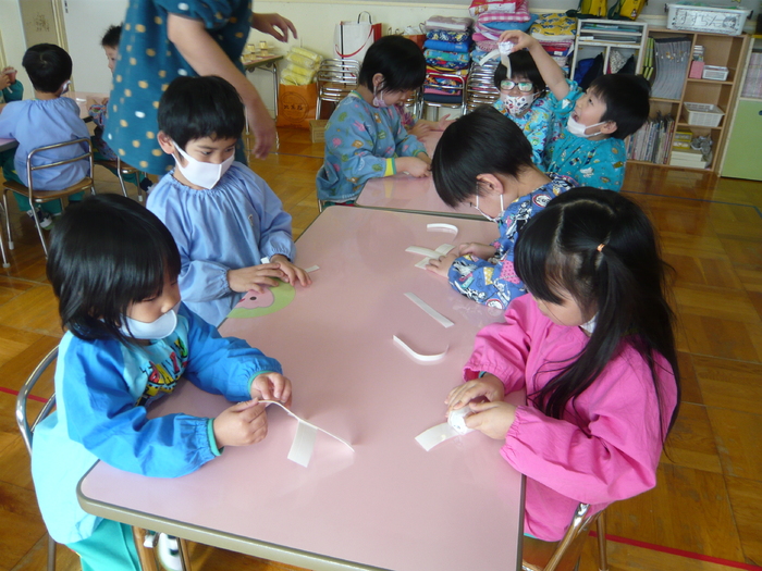 お店屋さんごっこの品物作りも三回目となり、慣れた様子で教室に集合する子ども達。各グループで、色々な廃材や材料に触れながら製作活動を楽しみました。自分たちで時間をかけて品物を準備することで、お店屋さんごっこへの期待もどんどん膨らんでいきます。品物作りが終わると年長さんが年下のお友達に絵本を読んであげたりと、優しいお兄さんお姉さんな姿も見られていました(^^♪ 今回は、『たぴおかグループ』と『たんじろうグループ』の様子をご紹介します。 | ||
