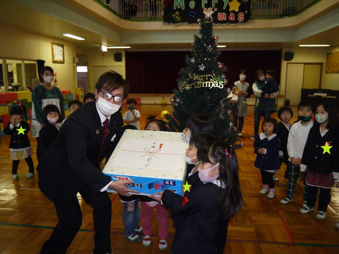 12月22日(火)、一般社団法人芦別青年会議所 さまより〝未来への芦跡~コロナ禍の君たちへ〟の事業として本学園(みどり幼稚園/附属保育園リリー)の子ども達のために…とこいのぼりを寄贈下さいました。 クリスマスツリーの前で道島会長様より子ども達に贈呈いただきました。大きな声で『メリークリスマス!!』と言いながら渡していただき、箱を開けると子ども達は、大喜び!!こいのぼりを見て大興奮していました。 毎年、風になびいていた本学園のこいのぼりも長年のお勤めでちょっぴりくたくたでしたが来年の子どもの日には、この こいのぼりがデビューし、澄み渡った空に元気になびくことでしょう!!楽しみですね。 芦別青年会議所の皆さま、子ども達に素晴らしいプレゼント本当にありがとうございました。 | ||
