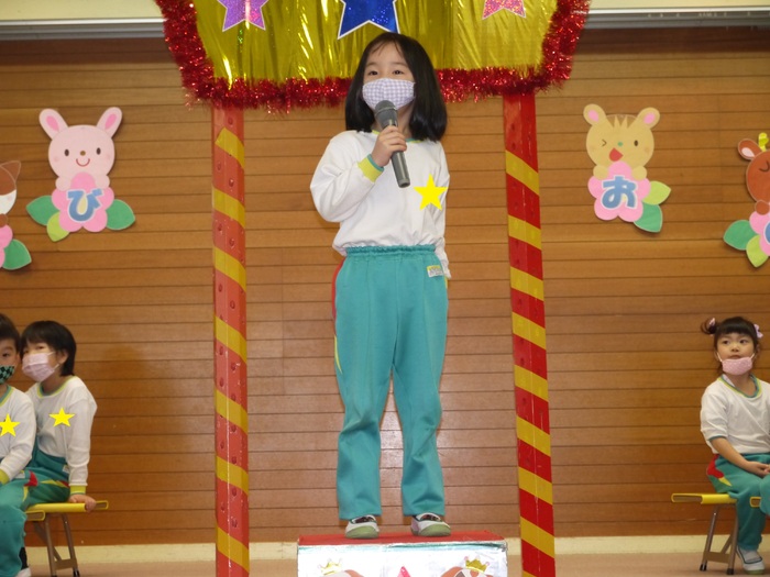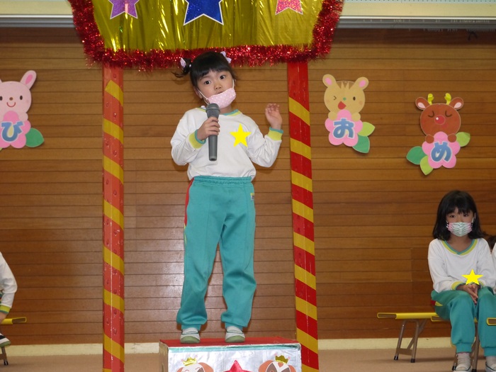 12月の誕生会では幼稚園14名、リリー保育園4名、計18名のお友達がお誕生日を迎えました。ちょっぴり照れながら自己紹介をする子がいたり、大きな声で堂々と“大きくなったら何になりたいか”を発表してくれたりと、一人ひとりがステージ上できらきらと輝いていました。今回のお楽しみはDVD『うさぎとカメ』のお話でした。ゴール直前でうさぎとカメが競る場面では「カメ頑張れ~!」「負けるな~!」と夢中になって声援を送っていた子ども達。最後まで、楽しんで誕生会を過ごすことが出来ました♪そんな誕生会の様子を少しだけご紹介します! | ||