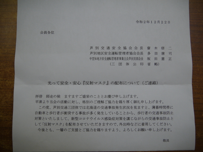 令和2年 12月23日(水) 交通三団体さまより 反射マスクを 寄贈いただき ました! | ||