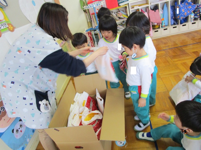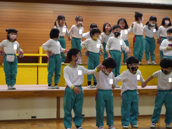 ちびっこランド・リリー保育園のお友達も集まって、子ども達が楽しみにしていたクリスマス会を行いました。サンタさんへ書いたお手紙を読もうと、ツリーの靴下を覗き込むと…なんと!サンタさんからのお手紙が!なぞなぞを解いていくと、年長さんの合奏で使う楽器とお手紙が次々に出てきました。最後に鈴を鳴らしステージに注目すると、サンタさんが登場‼今年は、サンタさんに各クラスで考えた質問に答えていただき、練習してきた歌と合奏も見ていただくことが出来ました。お手紙を書いてきてサンタさんに受け取ってもらった子や、抱っこをしてもらったけれど緊張して固まってしまっている子もいましたが、サンタさんが見えなくなるまでみんな大きく手を振って見送っている姿が印象的でした♪その後は、みんなでジングルベルのフォークダンスを踊り、持ち寄っていただいたプレゼントを交換しました。「何が入っているんだろう…★」と、ウキウキした様子で音楽に合わせてプレゼントを横のお友達に回し、笛の合図で自分のところで止まったプレゼントを開けてみる子ども達。「おもちゃが入っていた!」「手作りのマスクだ!」と、喜びの声を上げる一方で、「僕が持ってきたプレゼントじゃない…」と、可愛らしい勘違いをしている子の姿も…(笑)昼食時にはクリスマス仕様のケーキもいただき、とっても楽しいクリスマス会でした♪ | ||