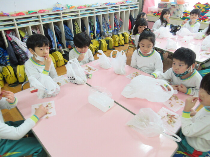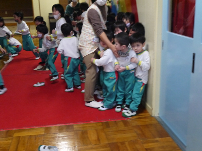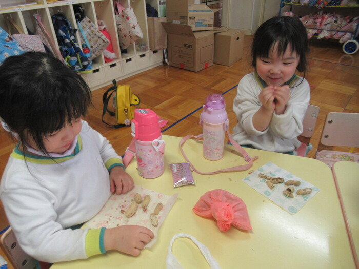 手作りの鬼のお面を作り、みんなで鬼ごっこをして遊ぶ姿が見られます。豆まき会では節分についての話をみんなで聞きました。鬼の登場に泣いてしまう子や逃げる子など様々な姿が見られました。沢山泣いた子も豆まきの時は夢中で拾い、沢山取れてとても喜んでいました。鬼を払って、今年一年健康で楽しい毎日になるよう願っています。 | ||