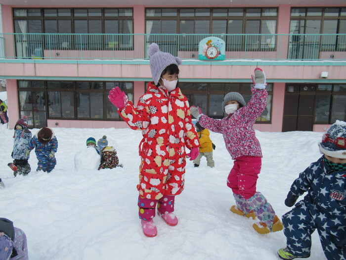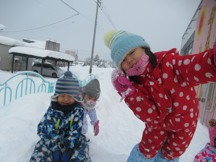 お天気の良い日に園庭で雪遊びを楽しみました。「今日は外に行けるかなぁ?」と前々から楽しみにしていた子ども達。大はしゃぎで、お友達と雪合戦をしたり、かまくらに入ったり、雪山で滑ったりと、雪遊びを十分に満喫しました。今後もお天気の良い日は外に出て遊ぼうと思っていますので、つなぎや帽子、手袋など忘れずに準備の方をよろしくお願いします。それでは、楽しんでいる子ども達の様子をご覧ください。 | ||