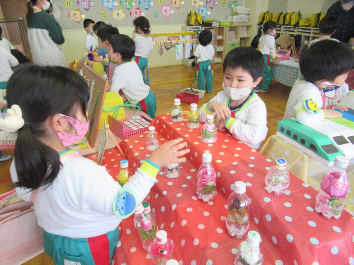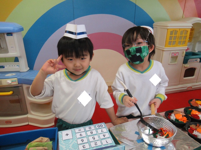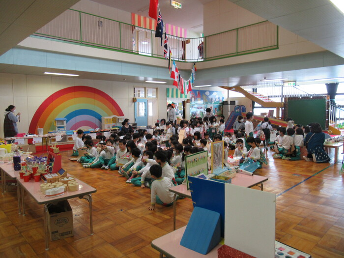 今年のお店屋さんごっこは『みどりフェスタ』です。世界のグルメ/八百屋・果物屋/お花屋/パン屋・スイーツ/ハンドメイドのお店を準備しました。 今年のお店屋さんごっこの準備では、初めての取り組みとして縦割り保育で6つのチームに分かれ、沢山の品物作りを行ってきました。縦割り保育ならではの楽しさも味わいながら異年齢の交流を深め楽しんで活動してきました。「今日は、何作るの?」と品物作りに期待を持ち、ニコニコ笑顔で取り組む子ども達がとても微笑ましかったです♪全ての品物を完成させ、お店屋さんごっこを楽しみにしてきた子ども達。本番では、大喜びで夢中になって活動していましたよ!!大きな声で「いらっしゃいませ~!」と張り切ってお店屋さんをする子や、家族の分の品物を買う子など、子ども達の可愛さ満点の姿が沢山見られる楽しいお店屋さんごっこ1日目となりました。 そして、今年も抽選会を予定しております。今年は『ドールハウス』です!どのお友達がドールハウスをゲットできるか今から楽しみですね(*^-^*) それでは、お店屋さんごっこ1日目の様子をご覧ください♪ | ||