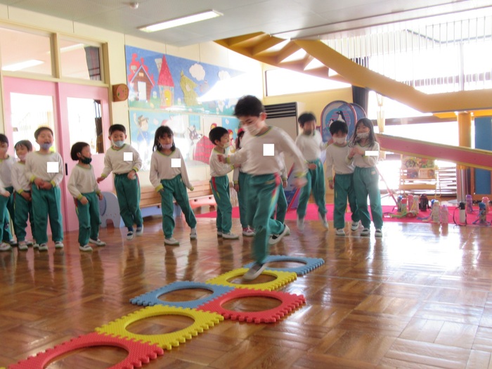 午前中はホールを広く使ったサーキット遊びをし、午後はお友達と一緒に触れ合いながらのリズム遊びと 絵本「おおきくなるっていうことは」を読んでもらいました♪ | ||
