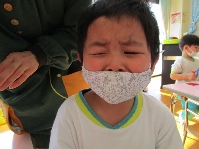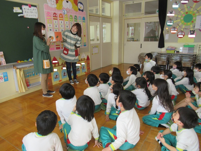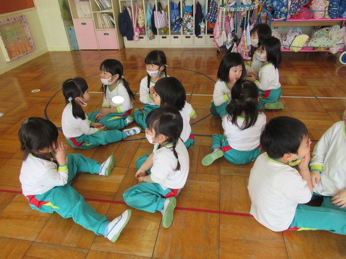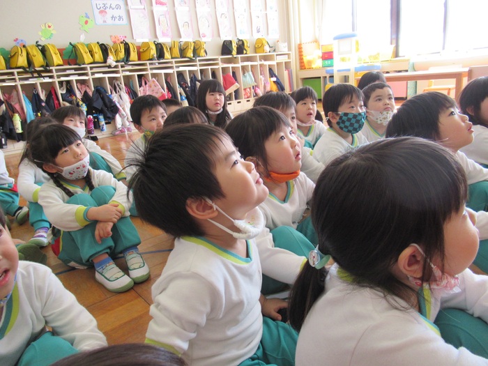 午前は音楽に合わせてリズム遊びを楽しんださくら組のお友達。「虹色のさかな」と「アンパンマン」のエプロンシアターを見て、色々なお話に親しんだ一日になりました♪ | ||