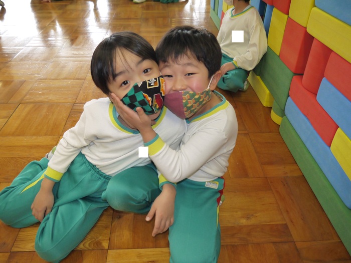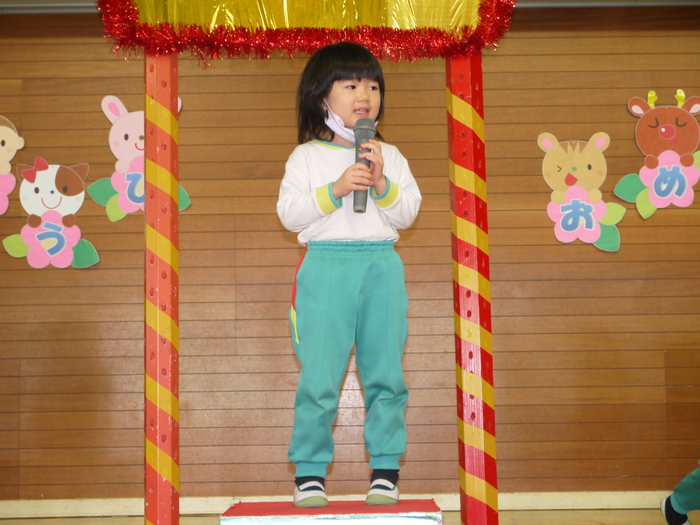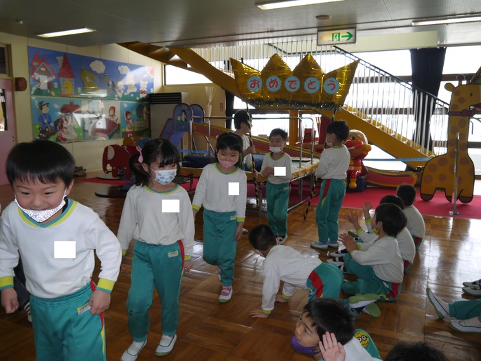 今年度最後の誕生会では、9名のお友達が誕生日を迎えました!自己紹介ではちょっぴり緊張しましたが、皆から大きな拍手を貰って嬉しそうな笑顔を見せていました。今月のお楽しみは先生たちによる劇「ともだちほしいなオオカミくん」でした。初めはオオカミの登場にびっくりしてしまう子もいましたが…お話が進むと、心優しいオオカミ君や森の動物達の真似をして一緒に踊る姿もあり、楽しいひと時を過ごしました♪ | ||