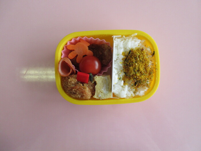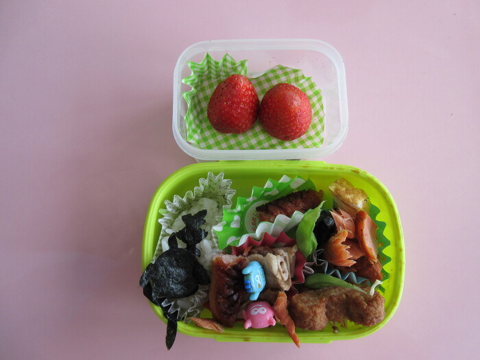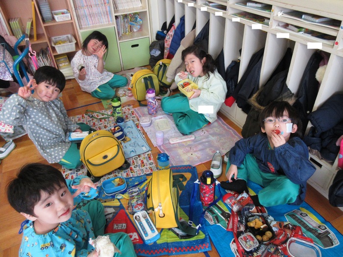 お別れ会でおやつも食べた子ども達でしたが、お昼が近づくと『お腹空いた~!』という声が聞こえてきます。お弁当の写真を撮ることを伝えカメラを向けると、『先生、見て~☆』と今日のおかずやデザートを教えてくれる子ども達。お弁当の歌やいただきますのご挨拶を終え、お弁当の蓋を開けると『先生、こっち来て~!!』と言い、もう一度嬉しそうにお弁当の中身を教えてくれる子も…☆大好きなお家の人からの手作りお弁当は、とっても嬉しいんだなぁ~と改めて感じる瞬間です。今回は、すずらん組のお弁当をご紹介します♪ | ||