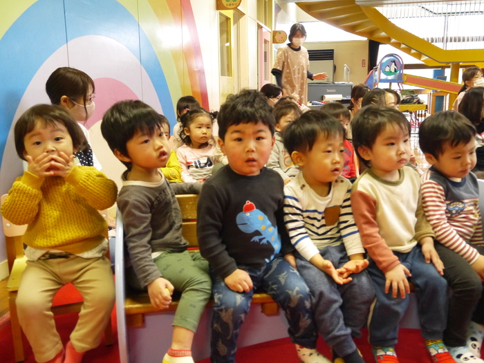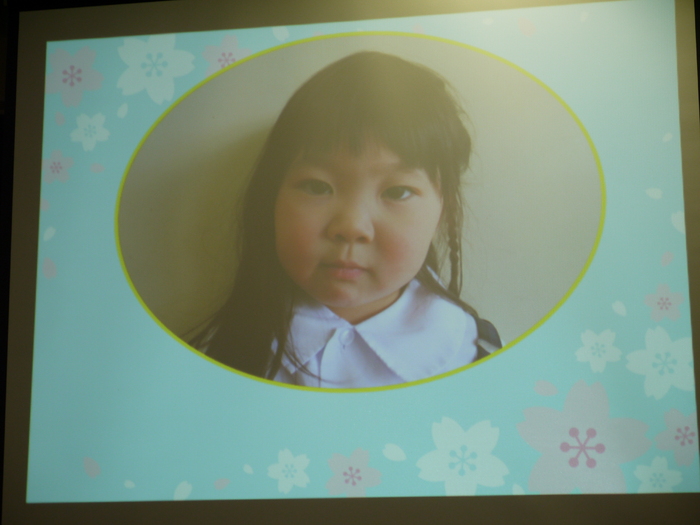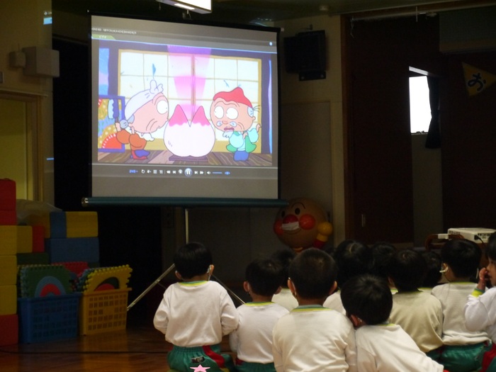 今年度初の4月の誕生会! 階段から元気に入場してきた8名のお友達。クラスのお友達からたくさんの声援を受け、とっても嬉しそうでした。大きくなったら・・・?の質問にも個々の夢を発表してくれました。お楽しみ会は、DVD日本昔ばなしの〝ももたろう〟大きなスクリーンに映ったお話にみいっていた子ども達でした。 今月のケーキは、チョコレートケーキ★昼食時にみんなで美味しくいただきました。 | ||