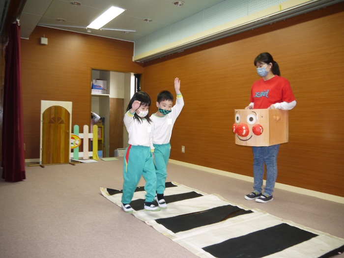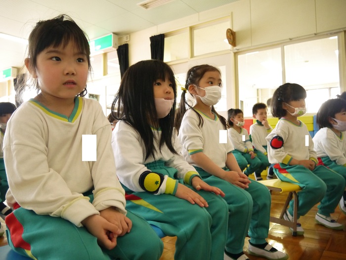 全園児がホールに集まり、交通安全教室が行われました。初めに、DVDを見ながら交通ルールを学び、先生達の寸劇を通して横断歩道の渡り方や不審者対応を勉強しました。「正しく横断歩道を渡れるお友達?」と呼びかけると、元気よく「はーい!!」とたくさんの可愛い手が挙がりました。数名の子ども達に横断歩道の渡り方を実践してもらいましたが、左右をよく見て車が止まったことを確認し、手を挙げて渡ることが出来ていました。不審者対応では、「一緒に行ったらダメー!」「怪しい人だよ!!」と言ったり「怖い~」と表情を曇らせる子もいましたが、安全に過ごすために様々なことをみんなで確認しながら、勉強することが出来ました。 | ||
