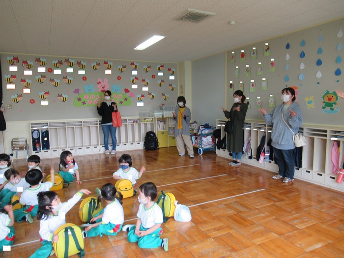 分散型保育参観日も最終日を迎えました。いつも通りの姿を保護者の方に見てもらおうと、最後まで楽しみながら活動に参加していた子ども達。各保育室から♪おかあさん♪の歌声も聞こえてきました。お見送りの際には、寂しさから涙する子も数名いましたが、お友達に優しい言葉を掛けてもらい、気持ちを切り替えて遊びを楽しんでいました。 保護者の皆様、お忙しい中園まで足を運んでいただき、ありがとうございました。各クラスの様子をご覧下さい。 | ||