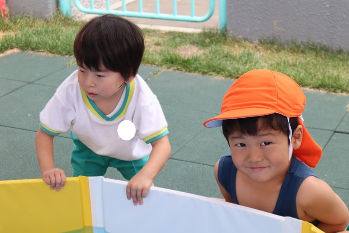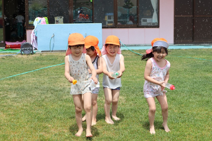 7月に入り、水遊びが始まりました! 子どもたちは、水遊び道具を持って来たときから、 『いつする?』 と、楽しみにしていました。 今回は、ちゅうりっぷ組とさくら組の水遊びの様子をお伝えします。 | ||