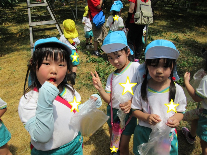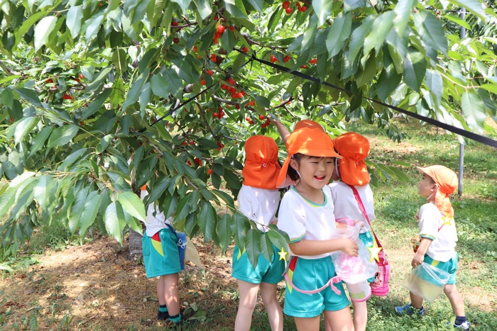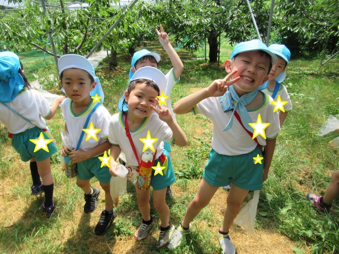 子どもたちは朝から「今日さくらんぼ狩りに行くんでしょ?」「いっぱい食べるんだ!」と楽しみにしている様子でした☆園バスに乗り、子ども達はウキウキと大橋さくらんぼ園に着くのを楽しみにしてました♪食べ方の説明を聞きいた後、子ども達は真っ赤になっているさくらんぼを食べて「美味しい~!」「もっといっぱい食べる!!」ととても満足していました。 | ||