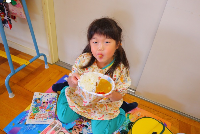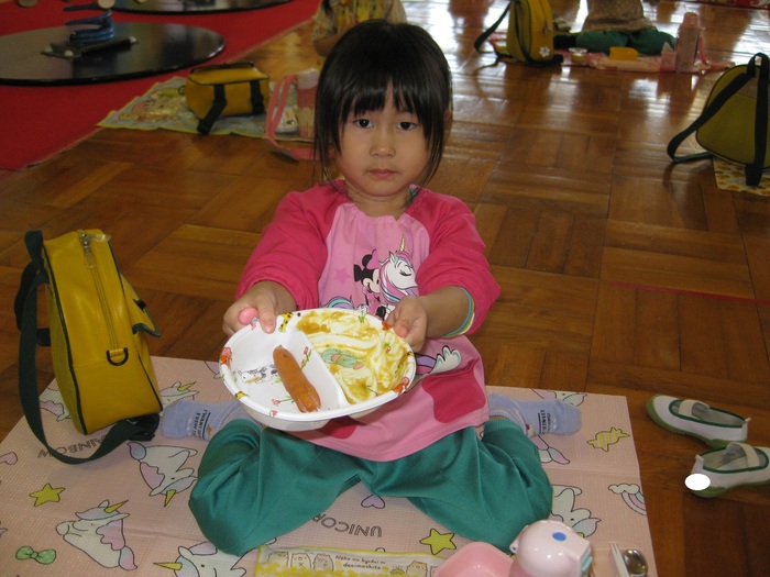 子ども達がとても楽しみにしていたカレーパーティーの日★年長さんは、種芋から大切に育て、自分達の手で堀ったり、洗ったりと経験し、楽しみにする気持ちも大きかったかと思います。朝、人参とじゃがいもの皮むきをしました!そんな皮むきをする年長さんの様子を見に行く年中さんと年少さんの姿も。カレーは給食さんに美味しく作って頂き、「美味し~い!!」と満足する子ども達の姿がありました。 | ||
