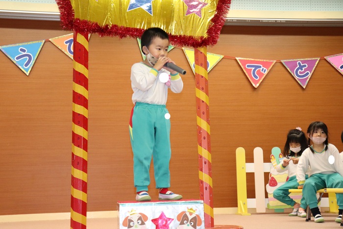 今月のお誕生会は、10月のお誕生者13名、お誕生月に参加できなかったお友達1名、計14名をお祝いしました。お誕生者さんは緊張しながらも、みんなの前で自己紹介や大きくなったらなりたいものを頑張って発表していました! 今月のお楽しみは、人形劇『テンプルちゃんとなぞなぞ狼』!!劇の中で出てきたなぞなぞを考え、合っていたときには「やったー!!」と大喜びする子ども達の様子がありました★ | ||