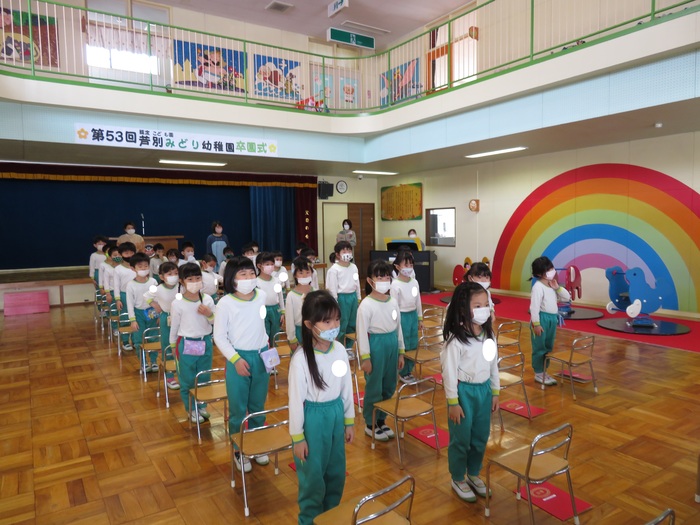 卒園生と在園生が一緒練習してきた卒園式の総練習が行われました。 本番のように…と一生懸命背中を伸ばし、姿勢を正す姿、 大きな声で歌ったり、返事をしたり、気持ちを一つにして取り組んでいました。 19日の卒園式までの残りの幼稚園生活、年長さん一人ひとりが楽しく過ごせるように、また年少さん、年中さんも素敵なお兄さん・お姉さんとの思い出を作ることが出来る日々になっていって欲しいです。 | ||
