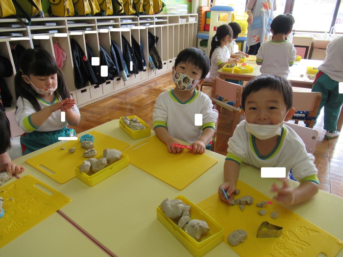 4月の子ども達の日常の様子をご紹介します! 春の暖かな陽気に誘われて、園庭に飛び出し遊んでいた子ども達。天気の良い日には『先生!お外行ってて遊びたい★』と子ども達からリクエストが出る程大人気です! クラス内でのお絵描きや粘土遊びもみんなで楽しく遊んでいました(^▽^)/ | ||