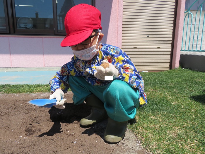 良い天気の中、年長児が園庭で畑作りを行いました。前日から種芋や枝豆の種を見ていたということもあり、「今日畑作りやるんだよね!」と、朝からとても張り切っている姿が見られました。軍手や長靴を身に着けて園庭に行くと、先生の説明を真剣な表情で聞いている姿が…。土を掘り種を入れて優しく土をかぶせると、「大きくなってね」と声を掛けている子もいました。水やりや草取りを通して年長児からの愛情をたっぷり受け、大きくておいしいジャガイモや枝豆になりますように…☆ | ||