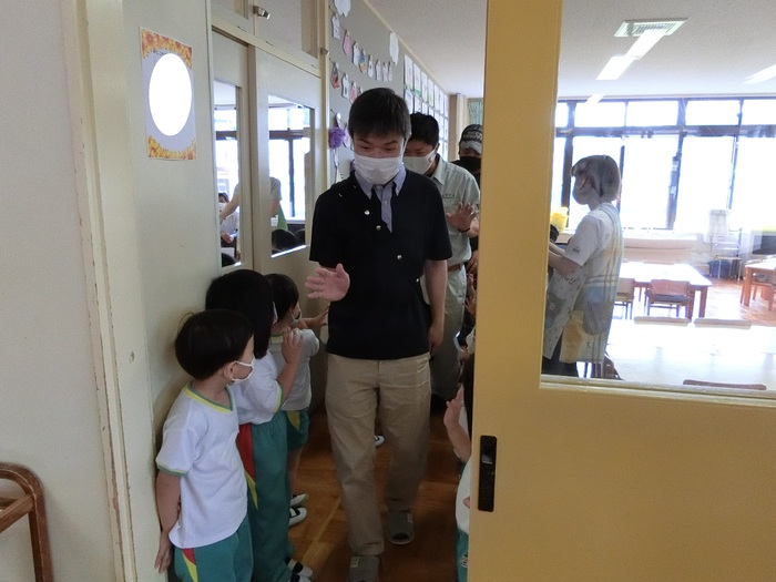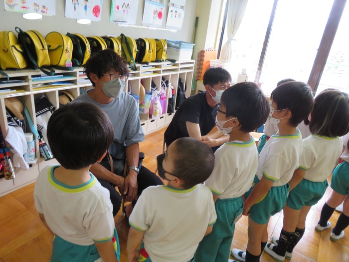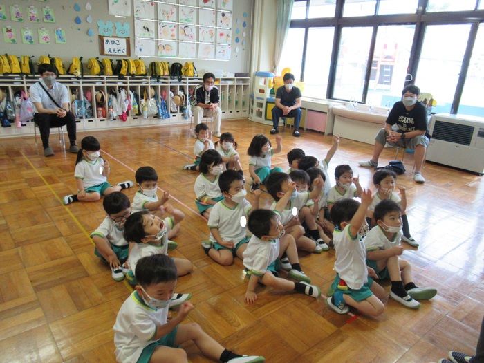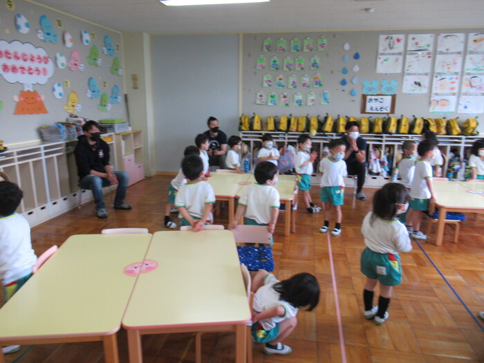 先日の父親参観の各クラスの様子です。進級・入園してからの初めての参観日で緊張する子もいましたが、3日間に分かれていたお陰もあり、少しずつ参観日に慣れていった様子が見られました。保護者の皆さまには、沢山ご参加いただきありがとうございました。普段の園の流れや子ども達の関わり方の様子を見ていただけたかと思います。今後も集団生活の中で沢山の楽しいこと思い白いことを一緒に見つけていきたいと思います! | ||