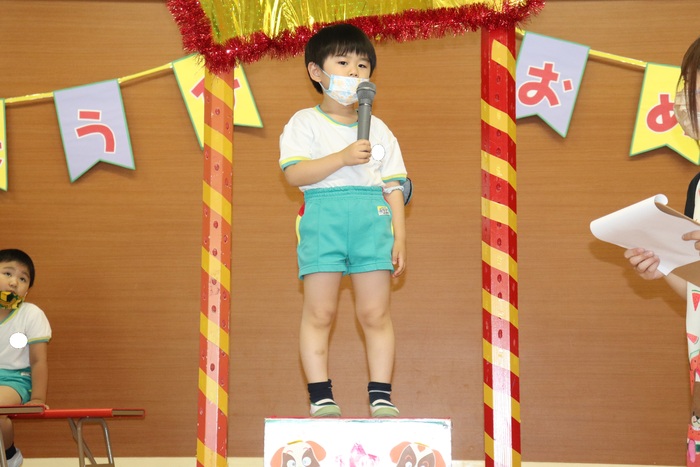 7月の誕生会が行われました!今月は13名のお友だちをお祝いしましたよ♪うれしさ半分、ドキドキ半分でしたが、自信を持って自己紹介している姿が見られました★今月のお楽しみは『3匹のこぶた』でした。おおかみにびっくりする様子もありながら、お友だちと楽しそうに見ていました! | ||