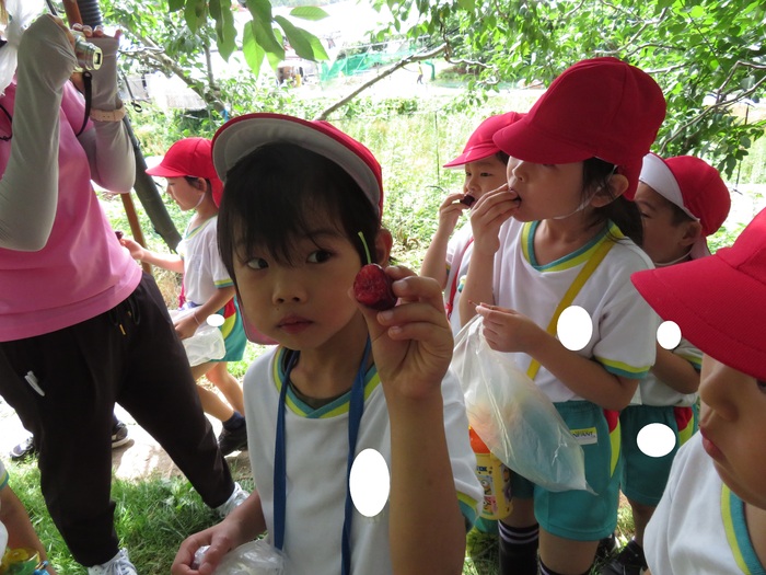 天気の良い中、大橋さくらんぼ園にさくらんぼ狩りに行ってきました♪ 園児全員が楽しみにしていた行事でもあります! バスに乗って、さくらんぼ園に到着! しっかりとお約束を聞いて、たくさんのさくらんぼの木のあるところに・・・ さくらんぼ園のご厚意で、滅多に食べられない大きなさくらんぼを頂きました!! 一口かじると、中も赤い色でみずみずしいさくらんぼでした♬ 自分で直接木からさくらんぼを採る、それをその場で食べることがとても美味しくて、 みんなパクパク食べていましたよ! 季節の美味しいさくらんぼを味わった一日でした。 | ||