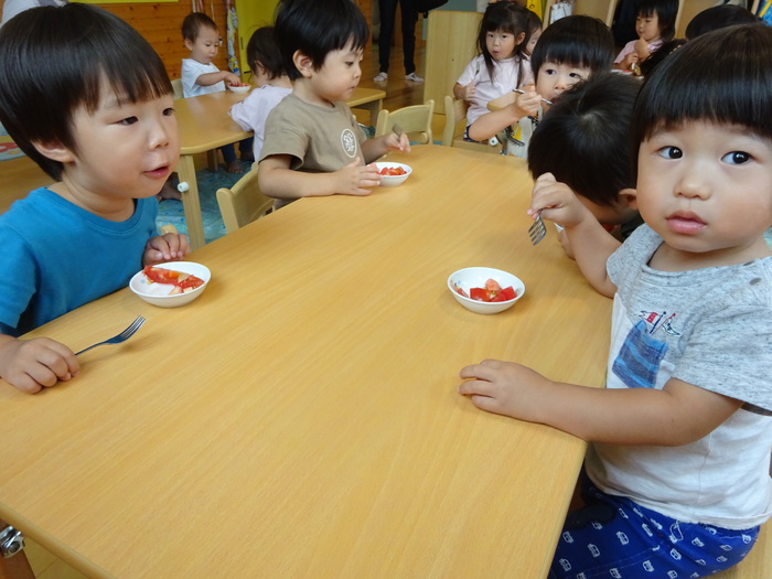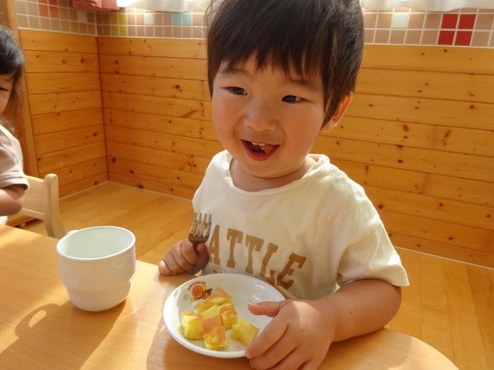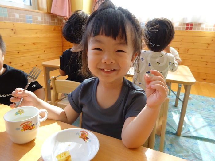 お盆が過ぎて少しずつ涼しい日が多くなってきましたが、 リリー保育園の子ども達は体調を崩す事なく元気に過ごしています♪ 元気いっぱい遊んでお昼寝をした後は皆が大好きな”おやつ”の時間! ベットから起き上がったらトイレを済ませてテーブルへ!! 皆、「今日のおやつは何かなぁ…」と期待を膨らませて待っています。 気になっておやつが置いてある調理室を覗いている子も…!! いざ、おやつを目の前にすると子ども達の目はキラキラ♪ スプーンやフォークを上手に使って食べるぱんだ組とうさぎ組のお友達。 ひよこ組のお友達は手を使って食べる練習を頑張っています。 皆で「いただきます」の挨拶をしたら、お友達と一緒に楽しく美味しく食べています。 | ||