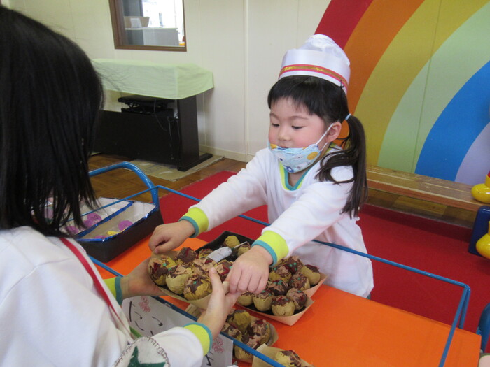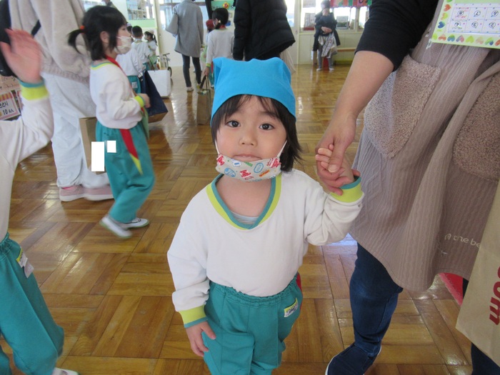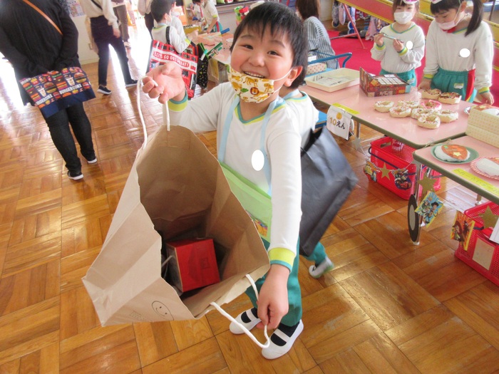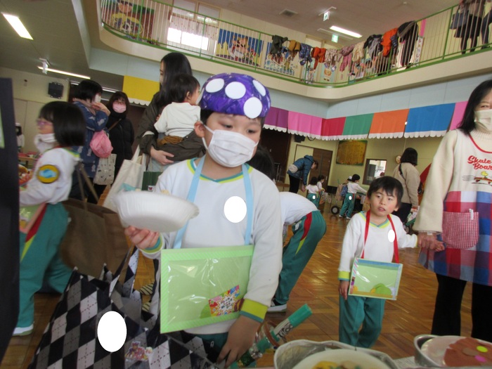 今年度最後の保育参観日が、2月22・24日の2日間で行われました。今回は、子ども達の大好きな『お店やさんごっこ』を参観していただき いつも以上に元気いっぱいで盛り上がった2日間でした。今回のテーマは【みどりモール~キッチンカーが来るよ!~】。売り手・買い手に分かれ、縦割りでの活動です。買い手の子ども達は、カバンを手に・財布を首から下げて《欲しいものを手にしよう!》と意欲満々!売り手の子ども達は、それぞれの売り場のコスチュームを身に付けて《売り切れにするぞ!》とやる気満々! 保護者の方々にも、少しですがお金を配布し一緒に楽しんで頂きました。『いらっしゃいませ』『この色が、おすすめですよ』『味は、辛くしますか?』など、なりきっている子ども達の姿や言葉に関心させれられたり、思わずわらってしまったりとあっという間の楽しい時間でした。 | ||