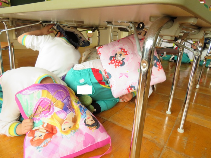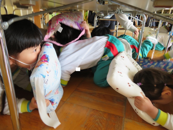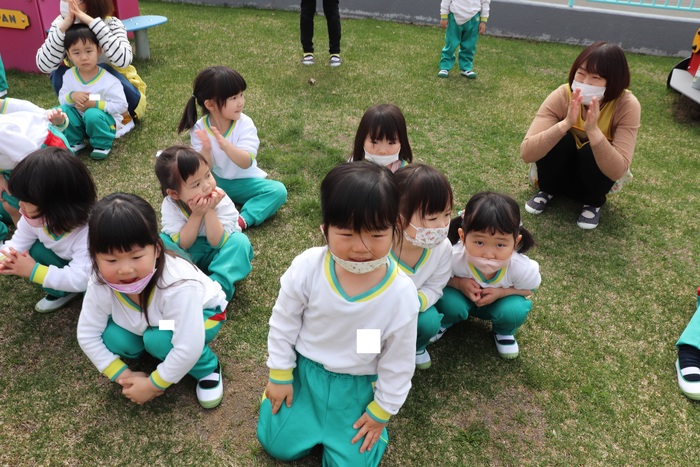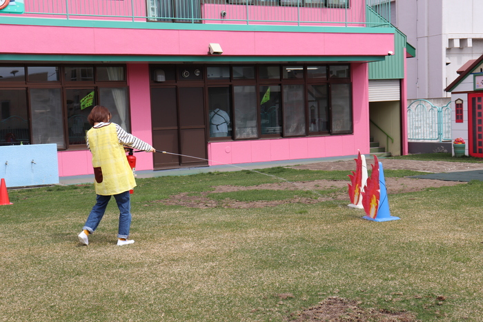 春の避難訓練を4月19日に実施しました。園内に大きなベルの音が鳴り、ちょっぴり泣いている子もいましたが、先生のお話をしっかり聞いて園庭に避難しました。タイムは、1分3秒93で全員が避難できました。 その後、水消火器の正しい使い方も教えてもらいました。クラスに戻ってから、地震に備えての訓練も行いました。 | ||