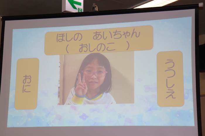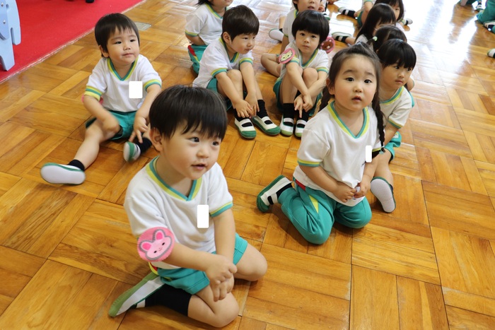 5月生まれ、7名のお友達をお祝いしました。 今月の質問は、〝怖いものは?〟〝好きなキャラクターは?〟〝得意なことは?〟の3つです。それぞれ個性的な答えで、会場が盛り上がりました! お楽しみは・・・人形劇『うさぎさん・たぬきさん・きつねさん ~かくれんぼ編~』。泣き虫のうさぎさん・のんびり屋のたぬきさん・怒りん坊のきつねさんの掛け合いが楽しい人形劇でした。 5月生まれのお友達☆お誕生日おめでとう! | ||