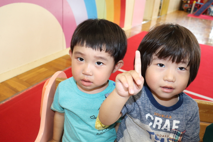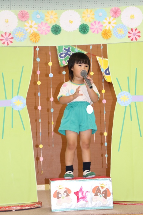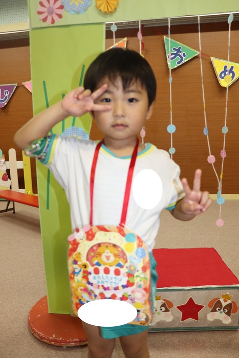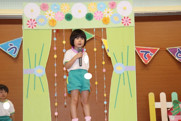 6月生まれのお友だちをお祝いしました! 今月の質問は… 『好きなテレビは?』 『大人になったらやってみたいことは?』 『頑張っていること』 の3つでした。 お楽しみは パネルシアター ピコピコテレパシーでしたよ。 ピアノに合わせて、先生の真似をして踊ったり、正解すると大喜びの子どもたちでした♪ | ||