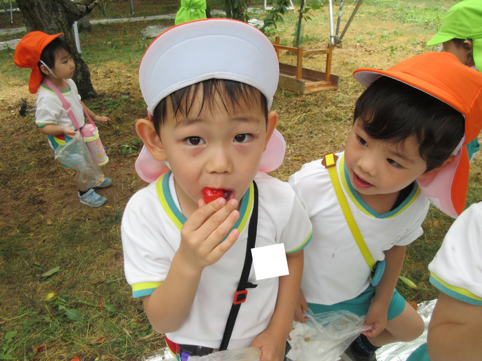7月18日(木)子ども達が楽しみにしていた”さくらんぼ狩り”に行ってきました! さくらんぼ狩り行く前、「さくらんぼいっぱい食べる」「大きいさくらんぼあるのかな」とワクワクの様子が見られました。 大橋さくらんぼ園に着き、説明を聞いた後、真っ赤なさくらんぼをたくさん食べていました。黒っぽいさくらんぼや黄色いさくらんぼもあり子ども達も嬉しいそうな様子が見られました。 | ||