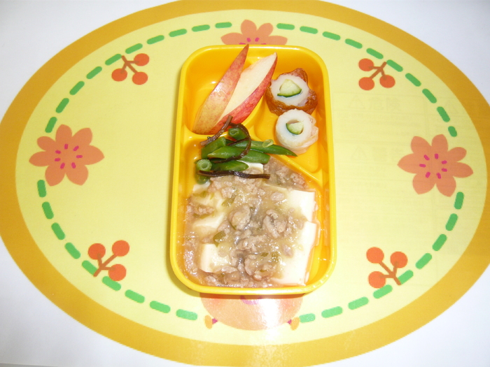 令和5年 9月21日(木) ★ 豆腐のそぼろあんかけ ★ いんげんソテー ★ ちくわちゃん ★ りんご | ||