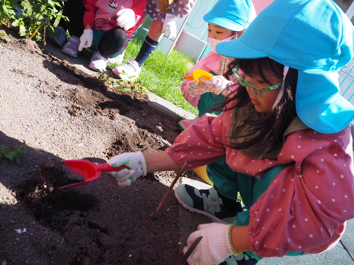 春から育てていたジャガイモを年長児のみんなで収穫をしました。土の中からコロコロと出てくるジャガイモを見つけると大喜びの子ども達。宝物を発見したかのように目をキラキラさせながら掘っていました。沢山採れたジャガイモはカレーパーティーで美味しいカレーにし、全園児でいただきます。 | ||