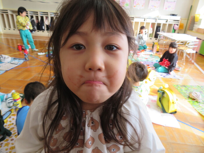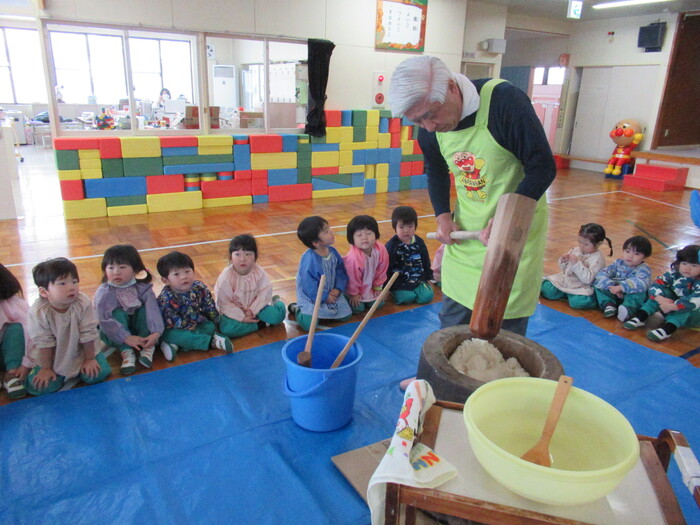 登園すると、いつもと雰囲気が違うホールに目を奪われる子ども達。 ブルーシートの上には『杵と臼』。薄っすら漂うもち米の匂いに、 心は踊ります! もちつき会に向けて、各教室では本や紙芝居を見て『餅はどうやって できるのか・・・?』『もちつきに必要な、道具や材料は何か?』を 学びました。 クラスの順番が待ち遠しく、何度も教室からホールを覗くたくさんの 目!目!目!!ホールでは、みんなの元気な掛け声が響きます! 「よいしょ!よいしょ!よいしょ~!」 昼食時には、一生懸命についたお餅が『おしるこ』になって登場☆ 今年も、みんなで美味しくいただきました!! | ||