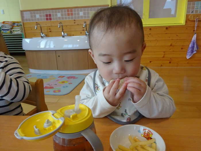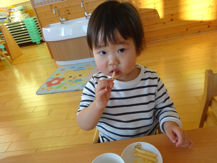 日に日に寒さが増し、 本格的に冬が訪れました✨ 寒さに負けないリリーの子ども達★ 元気いっぱい遊んで ぐっすりお昼寝をした後は・・・ みんなが大好きな”おやつの時間” 『今日のおやつ何~?』と保育者に 質問する程楽しみにしています♪♪ おやつが目の前に来ると 早く食べたくて待ち切れない子ども達です! 『いただきまーす!』と大きい声で 挨拶をして友達とお話しをしながら 楽しく食べています☆☆ | ||