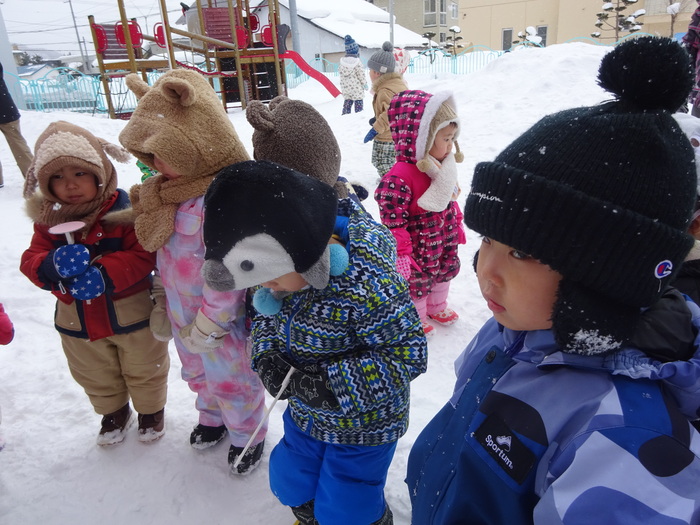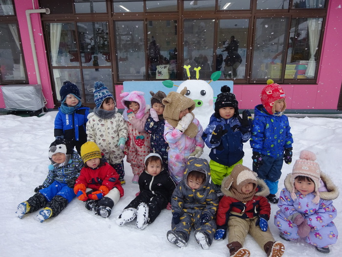 令和6年最初のちびっこランドは、幼稚園の満3歳児と 附属保育園リリーの2歳児との交流を兼ね〝雪像づくり〟 をしました。子ども達は、寒さに負けず、元気いっぱい園庭で雪遊びを楽しみながら今年の干支『辰』の雪像を作成しました! | ||