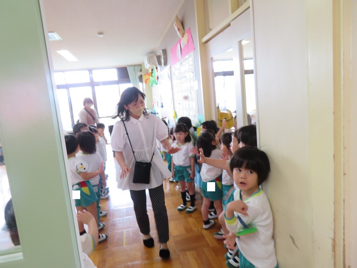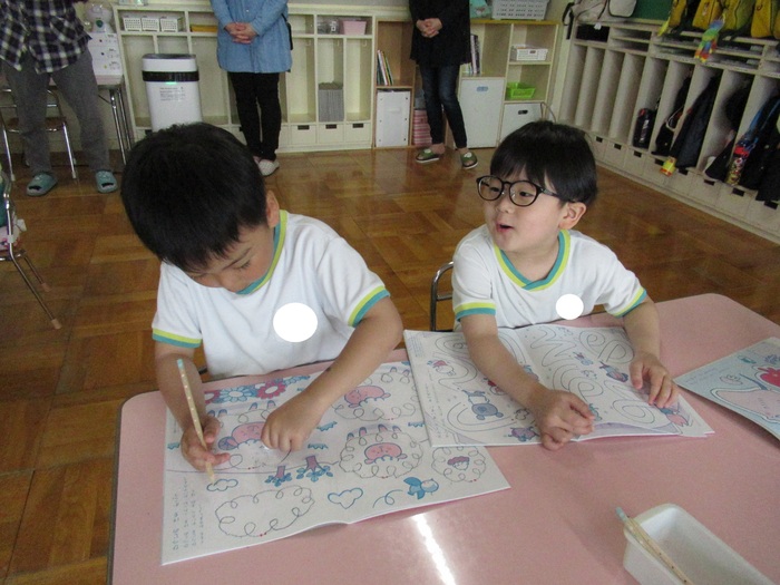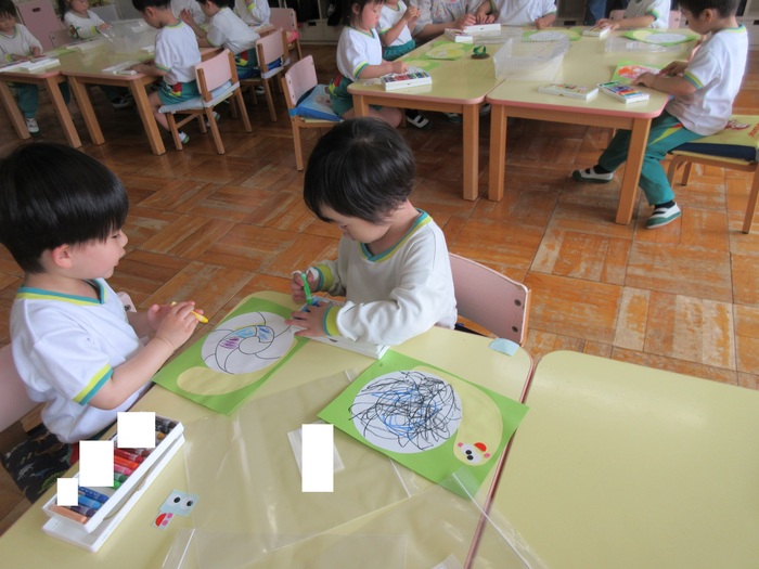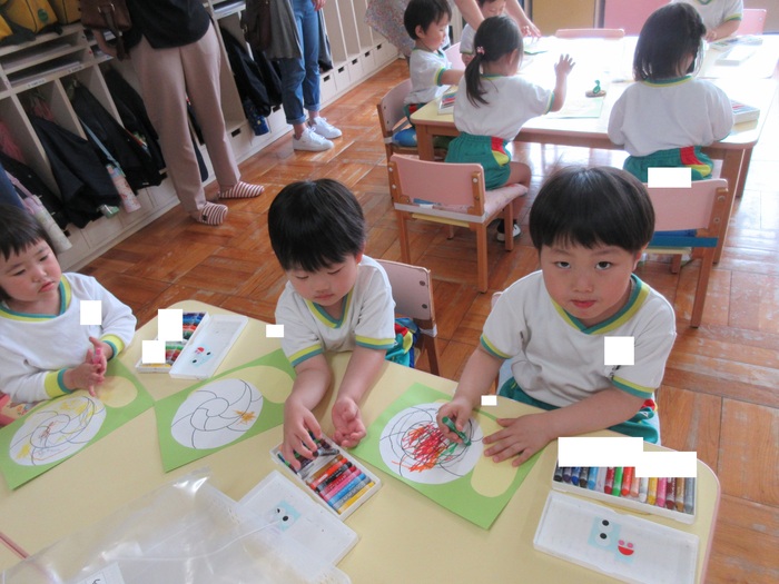 今年度始まって初めての参観日。ばら組『絵具遊び・デカルコマニー(Tシャツ)』『絵本』ゆり組『ワーク』『絵本』すずらん組『リズム遊び』『仲間集めゲーム』『絵本』さくら組『製作(かたつむり)』をそれぞれ行いました。とっても張り切る子・緊張してしまう子など様々な様子が見られましたが、一人ひとり精一杯頑張ったのではないでしょうか。 | ||