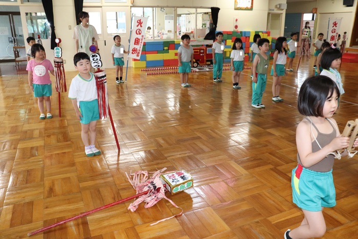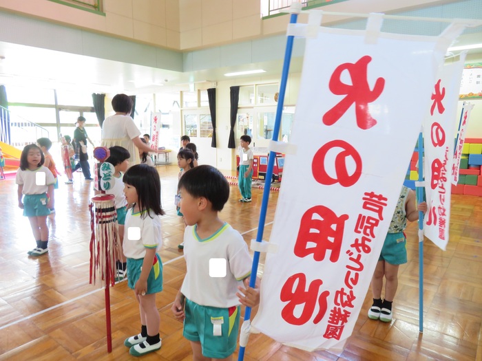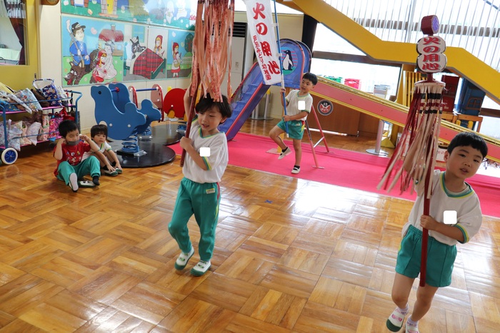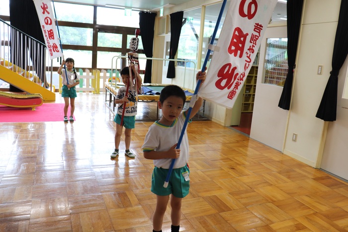来る、6月30日(日)に開催される〝中空知連合消防演習並びに芦別消防演習に伴うパレード〟に向けての練習を始めました。子ども達は個々に自分がやりたいものを担当し、とっても張り切っています。クラス内でも言葉や防火標語、纏やのぼりの振り方、拍子木のタイミングなどの個別練習を重ね、全体での練習に入りました。 昨年度の経験もある子ども達は、一つひとつの動きも機敏で言葉や標語、歌も初日からバッチリ✨でした。来週からは、戸外で行進の練習も含めて練習をし、30日(日)の本番に向けて取り組んで行こうと思っています。 子ども達の頑張っている姿をご紹介します! | ||