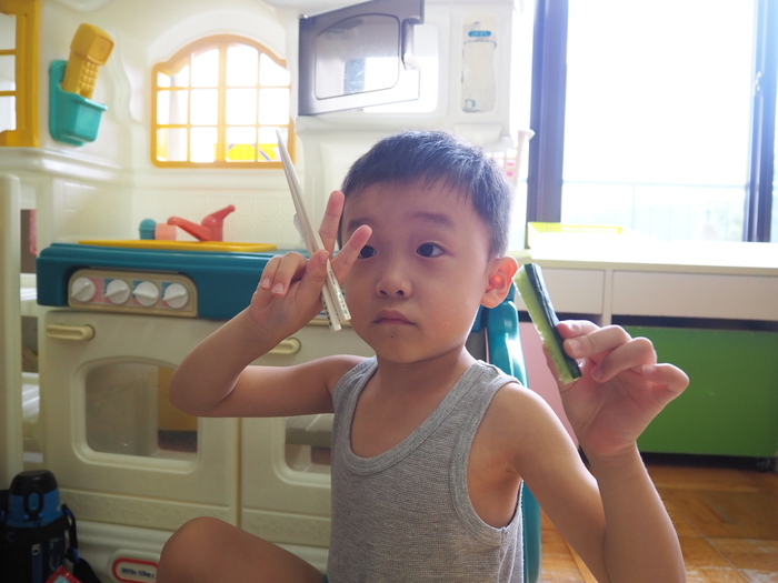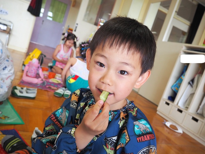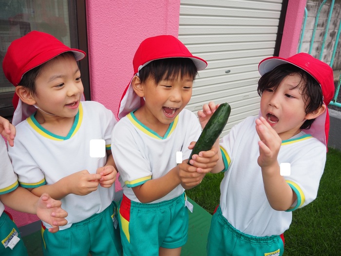 5月に年長組が植えた〝きゅうり〟が大きく生長し、初物✨収穫しました! じゃがいもときゅうりを植えてから、園庭に行く度に〝大きくなったかなぁ…〟〝おいしくなぁ~れ!〟と見に行き、水をあげたりとお世話をしていた子ども達。黄色い花が咲いてから小さな実が付いてから少しずつ大きくなっていくのを心待ちにしていました。そしてそしてやっと収穫の時!! 自分達で育てた野菜の収穫は、喜びもひとしおだったことでしょう。 ばら組はスティックにし味噌をつけ、ゆり組は漬物にしみんなで給食時に食べました。この〝きゅうり〟の味は、子ども達一人ひとりにとって今までで一番美味しかったことと思います。 これからもしっかりお世話をしながらたくさんのきゅうりを収穫し、おいしくいただきます!! | ||