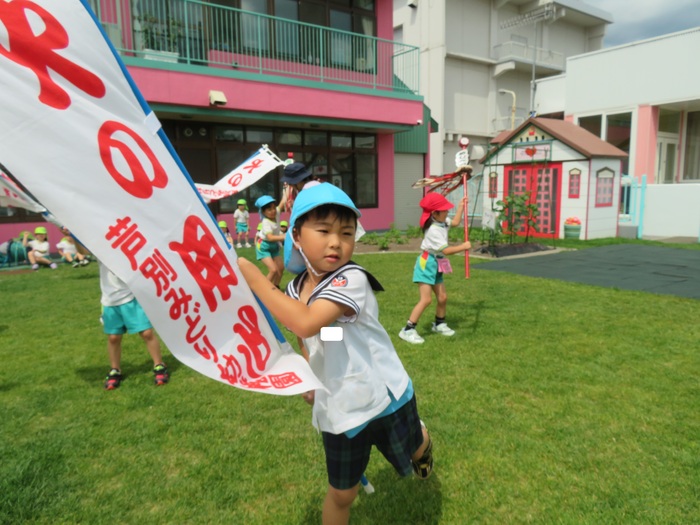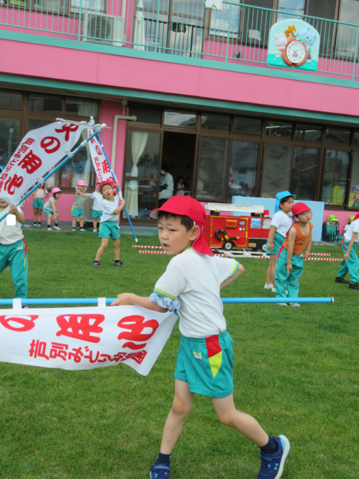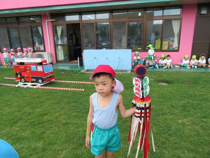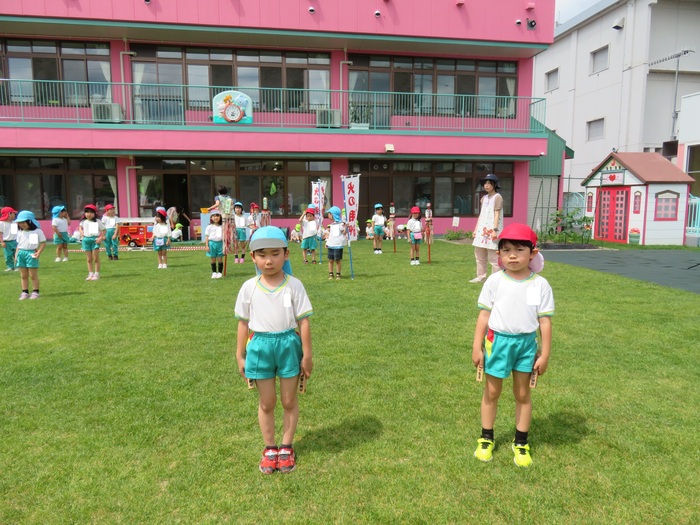 明後日、30日(日)は消防パレード! 今週からは、外で行進の練習も加えました。約2週間の練習期間を経て、いよいよ本番を向かえます。 子ども達の準備は、もうバッチリ! 当日を心待ちにしています。明後日、30日(日)子ども達の元気なアトラクションを楽しみにしていて下さい。また、当日は気温も高めの予報となっておりますので熱中症対策も併せて、お願いします! Part.2では、外での練習の様子をご紹介します! (毎日、年長組の練習を応援してくれたすずらん組・さくら組のお友達もちょっぴり載せました!) | ||