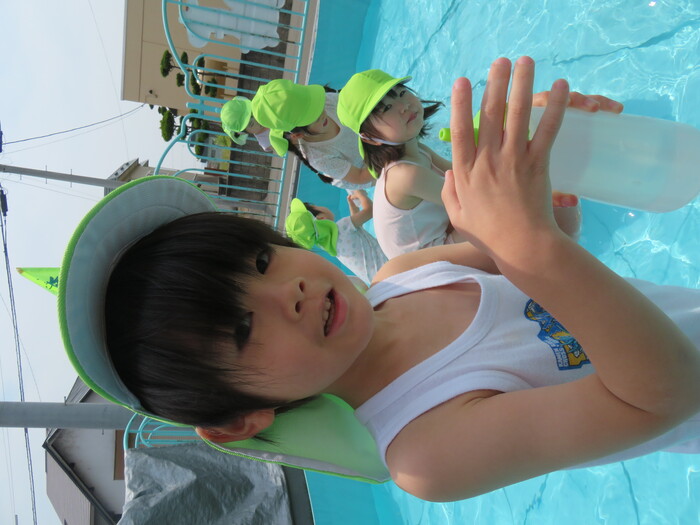 7月に入り、水遊びが始まりました! 天気が良い日には、「今日晴れてるから水遊びできるよ」と嬉しそうにしている子ども達。 準備を終え、いざプールの中に入ると友達同士で水をかけ合う姿やプールの中を泳いで楽しんでいる姿が見られました。 | ||